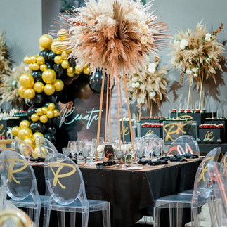 I absolutely loved this celebration for three reasons. First, the family's energy was incredible from the very first meeting. Second, using black as the primary color is unconventional, but the result was fascinating. Finally, the TOTAL BLACK dress code perfectly complemented our concept, where we used pampas grass throughout the entire venue.